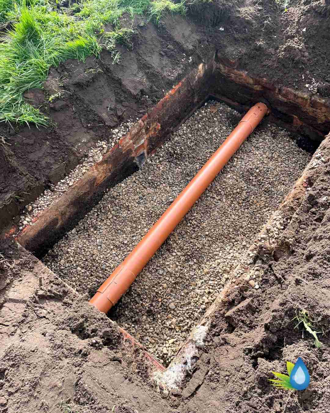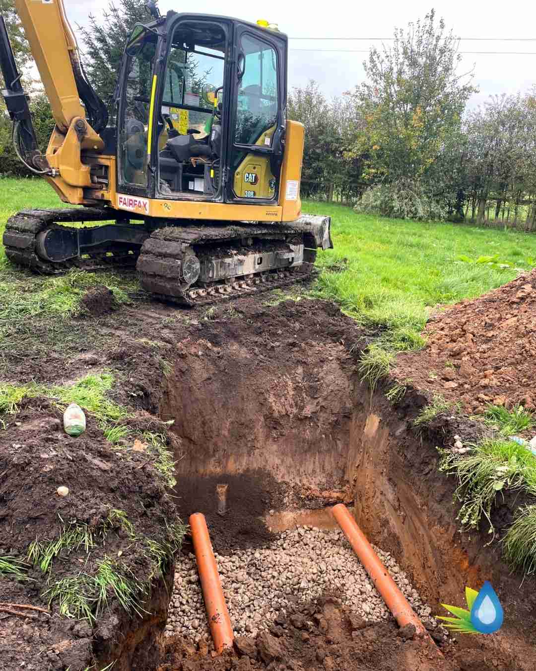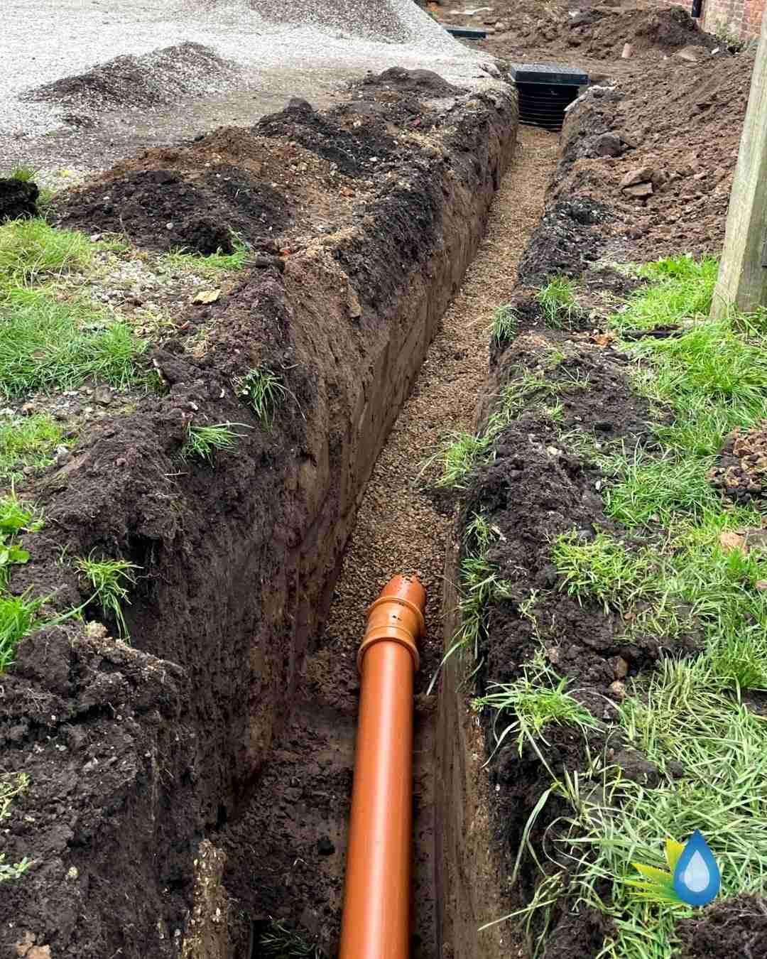 - Drainage Works – (Installation of four inlet inspection chambers (250mm–950mm deep) and one outlet chamber (circa 1100mm deep). Installation of roddable gullies for kitchen waste, surface water and foul water. 22m of foul drainage in concrete areas (reinstated by others). 29m of inlet/outlet pipework in gravel and grassed zones. 60m of drainage field using slotted 110mm pipe, bedded in clean washed gravel, protected with membrane and laid in 1500mm trenches. Jetting of surface water drain.