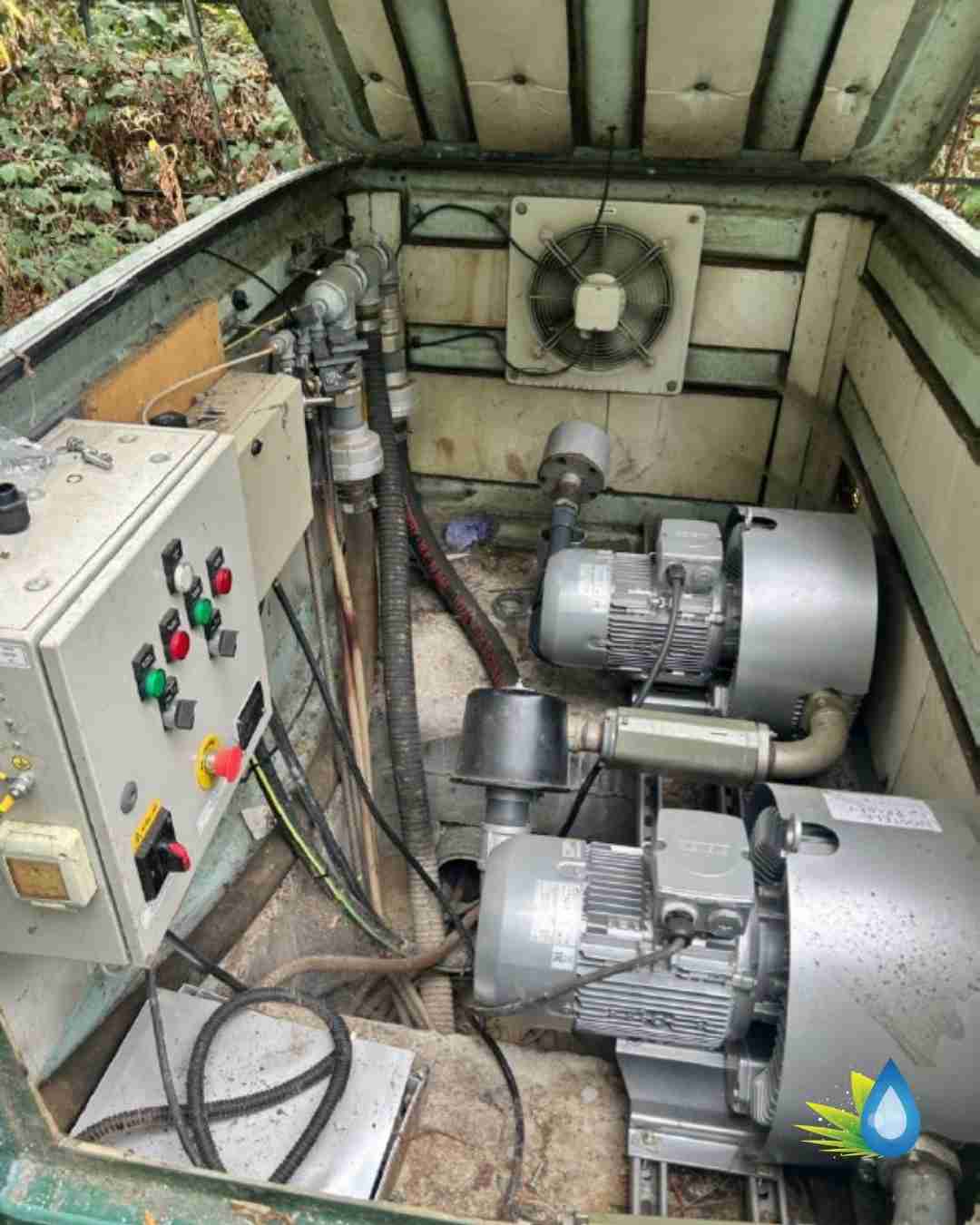 Next, our engineer inspected both blower units, which are responsible for supplying air to the treatment zones. Each blower was confirmed to be running correctly, delivering the appropriate airflow to support the aerobic digestion process. The air intake filters inside the blower pipework were cleaned to remove any dust or debris that could restrict airflow and reduce efficiency.