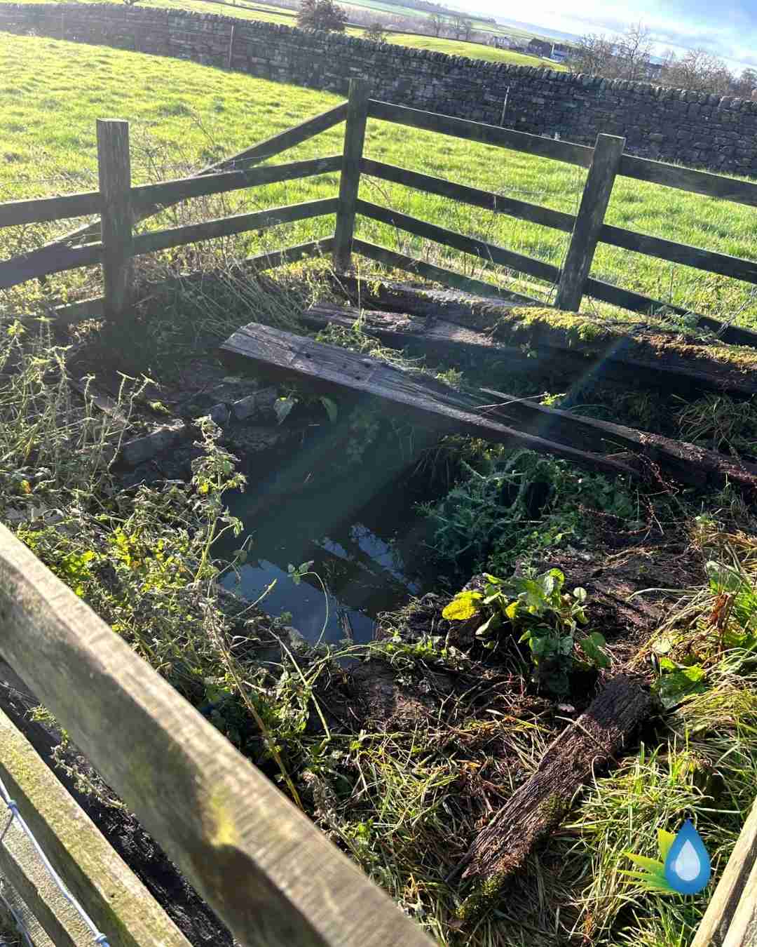 A dye test was performed on a pipe running from the barns to the tank and rainwater pipes around the property appeared disconnected, with open downpipe outlets discharging onto the ground. A deep soakaway adjacent to the soil pipe was identified, but it seemed to run beneath the property without any visible chamber.