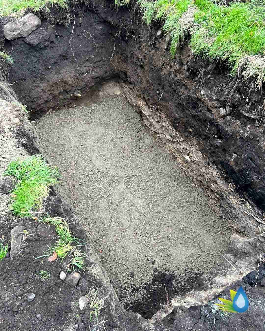 Percolation tests revealed ground conditions consisting of gravel over sandy clay, which influenced the design and size of the drainage field. This step was critical to ensure the system operates efficiently and complies with environmental standards.